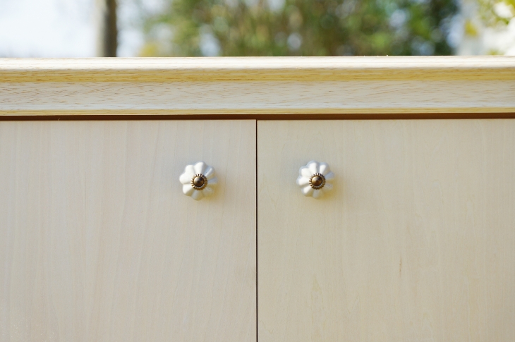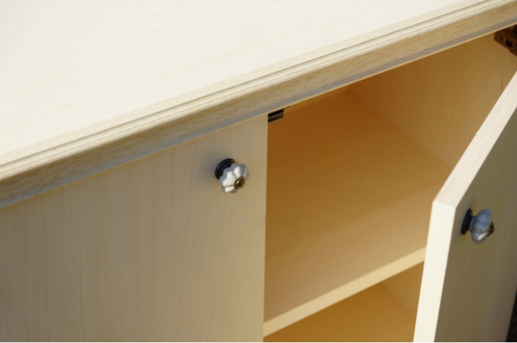 高さ81cmと程よい高さの天板の周囲には面を取ったモールが回してあり、少し甘めの雰囲気を出してくれます。両開きの扉を開けると、中は中間に固定式の棚板が1段。上段・下段ともに内法高さが約30cm、内法幅が85cmとなります。