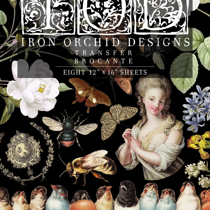 IOD DECOR TRANSFER™ 「Brocante」 木製品や金属にこすって貼るシールです。 フランスの時間を経た美しさを軽やかで、繊細に描いたデザイン。