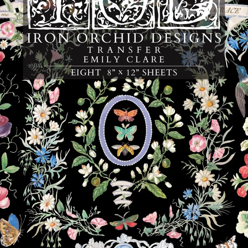 IOD DECOR TRANSFER™ 「Emily Clare」 木製品や金属にこすって貼るシールです。 1868年のエミリー・クレア・ハーヴィー嬢の家族アルバムに描かれている気まぐれで美しい手描きの細部にすぐに惚れ込み着想を得た作品。